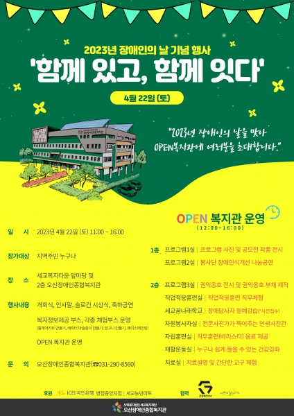 [금요저널] 오산장애인종합복지관은 제43회 장애인의 날을 맞이해 오는 22일 복지관 앞마당과 프로그램실에서 장애인 및 비장애인이 함께 참여할 수 있는 “함께 있고 함께 잇다”를 개최한다고 밝혔다.