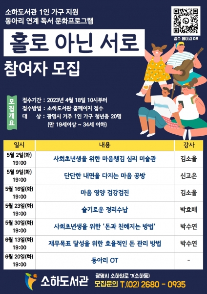 [금요저널] 광명시 소하도서관은 오는 5월부터 8월까지 광명시 거주 1인 가구를 대상으로 하는 1인 가구 지원 프로그램 ‘홀로 아닌 서로’를 운영한다.