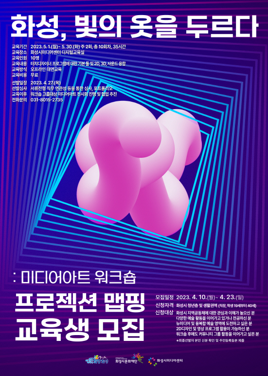 [금요저널] 화성시문화재단 화성시미디어센터는 지역 기반의 청년층 미디어아트 전문가 양성을 위해 ‘미디어아트 워크숍: 프로젝션 맵핑 ‘화성, 빛의 옷을 두르다’’ 교육생을 모집한다.