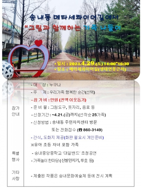 이번 행사는 우리 동네의 아름다운 메타세콰이어길을 홍보하고 유년기 아이들에게 가족, 친구, 이웃이 함께하는 소중한 추억을 선사하기 위해 마련된 것으로 사생대회 및 버스킹 공연 즐기기, 가족운동회 등 다양한 이벤트가 진행된다.
