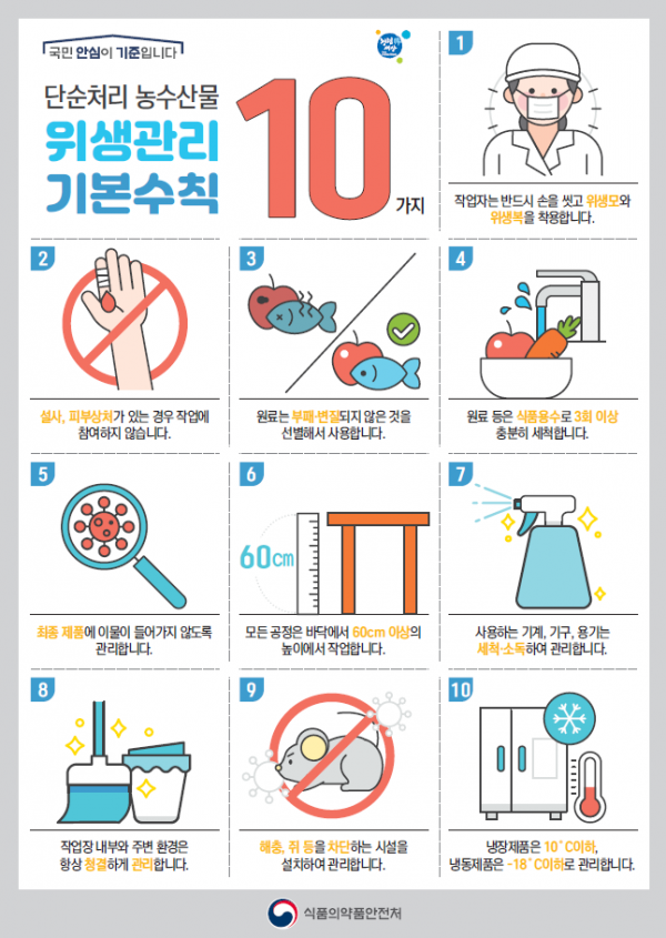 식약처는 안전한 단순처리 농·수산물 생산을 위해 업체에서는 원재료의 위생적 취급 등 위생관리 기본수칙을 준수하는 것이 중요하다고 강조했다.
