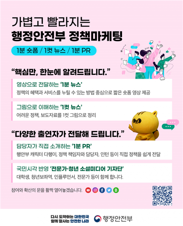 행정안전부는 짧고 재미있는 콘텐츠를 선호하는 최근 경향에 맞추어 숏폼 형태의 '1분 뉴스'와 그래픽형 보도자료인 ‘1컷 뉴스’ 제작 강화를 통해 빠르고 쉽게 정책 내용을 전달하는 등 세대별 특성에 맞는 맞춤형 콘텐츠를 지속적으로 선보일 계획이라고 전했다.