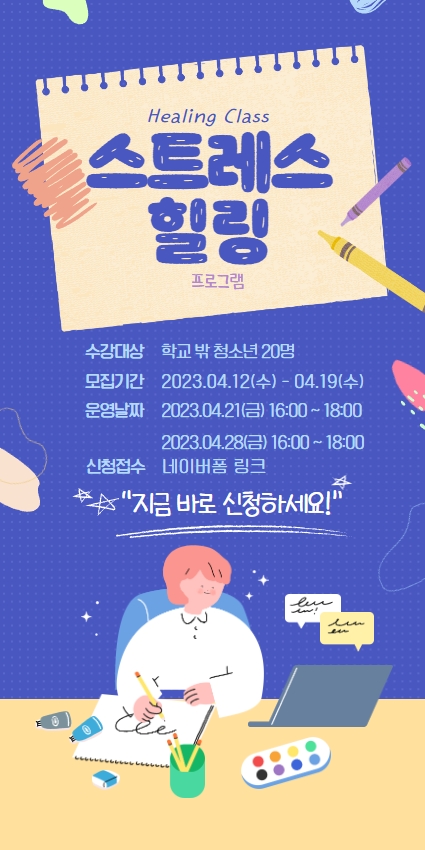 이번에 운영하는 스트레스 힐링 프로그램은 청소년 수요조사를 통해 선정된 프로그램으로 전문 강사 초빙을 통한 그림 검사, 스트레스 수준 이해, 스트레스 대처자원 탐색, 대처전략 수립 등 집단 및 개별 활동으로 진행된다.