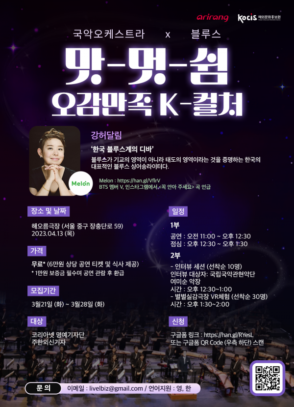 이번 공연에서는 블루스의 디바인 강허달림이 ‘정오의 스타’로 출연, ‘괜찮아요’, ‘기다림, 설레임’, ‘꼭 안아 주세요’를 국악기에 맞춰 편곡해 선사할 예정이다.