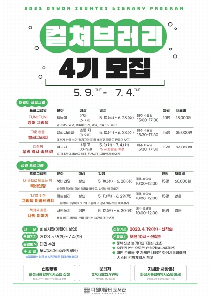 [금요저널] 화성시립다원이음터도서관은 오는 19일 2023년 상반기 독서문화교실‘컬쳐브러리 4기’참여자를 모집한다고 밝혔다.