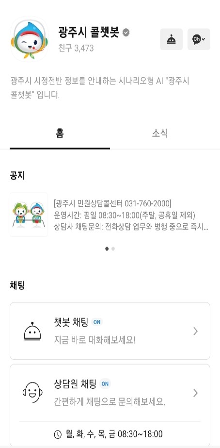 시 관계자는 “카카오톡 친구 찾기에서 ‘광주시 콜챗봇’ 을 검색한 후 ‘챗봇 채팅’ 및 ‘상담원 채팅’을 클릭하면 누구나 쉽게 이용이 가능해 콜챗봇 활용을 적극 독려한다고” 전했다.