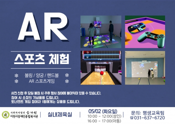 이에 오는 5월 2일(화) 장애인은 물론 지역사회 주민에게도 AR스포츠를 경험할 수 있도록 ‘하루체험’이 진행된다. 체험에는 양궁, 볼링, 핸드볼 스포츠 게임이 진행되며, 성인은 10시~12시 아동은 16~17시 참여가 가능하다. 사전신청은 4월 19일까지 받으며, 신청 및 기타 문의는 평생교육팀(070-4612-9836)으로 전화하면 된다.