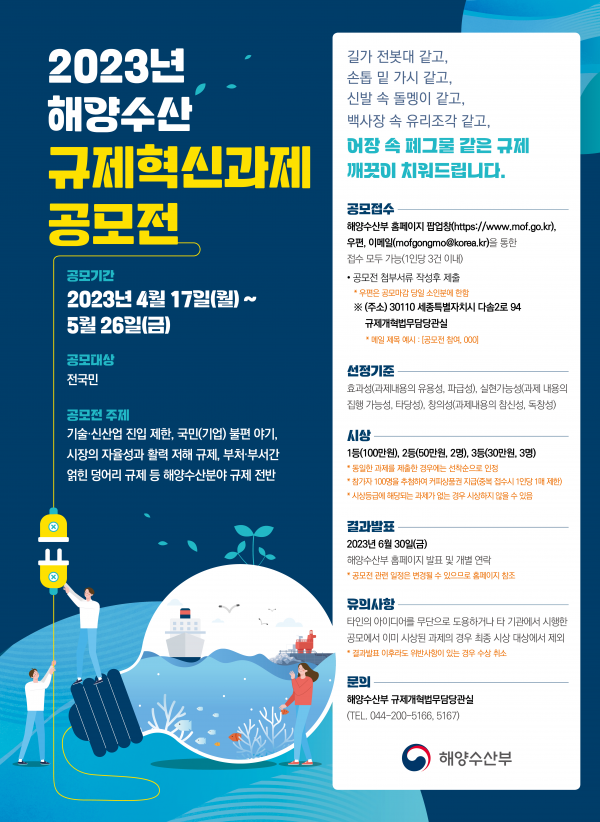 해양수산 규제혁신 협의체 팀장을 맡고 있는 전재우 해양수산부 기획조정실장은 “이번 공모전을 통해 해양수산 현장의 어려움을 가까이에서 듣고 규제혁신 전 과정을 국민의 관점에서 추진해 나가겠다”며 “평소 불편하게 느꼈던 규제를 개선하고 정책 수립에도 참여할 수 있는 기회인 만큼, 국민 여러분의 많은 관심과 참여를 부탁드린다”고 말했다.