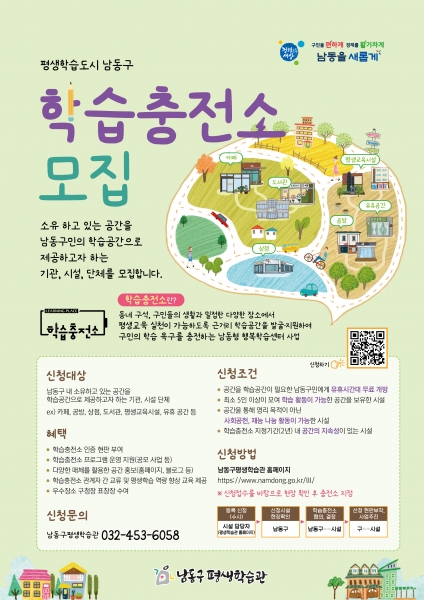 학습충전소 모집은 연중 상시로 진행되며 신청은 남동구평생학습관 누리집을 통해 가능하다.