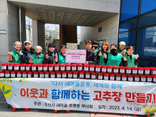 [금요저널] 오산시 초평동 새마을부녀회가 지난 14일 초평동 행정복지센터에서 ‘이웃과 함께하는 고추장 만들기’행사를 열고 수제 고추장 총 100통을 기탁했다.