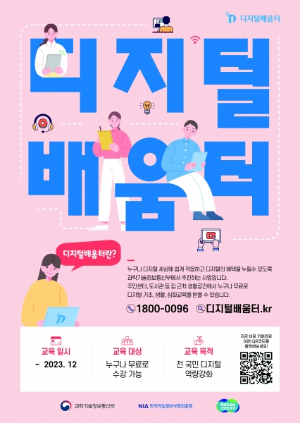 전국 1천여 개소가 운영 중인 디지털 배움터는 집에서 가까운 교육장에서 시민들이 디지털 교육을 받을 수 있도록 과학기술정보통신부, NIA 함께 펼치고 있는 사업이다.