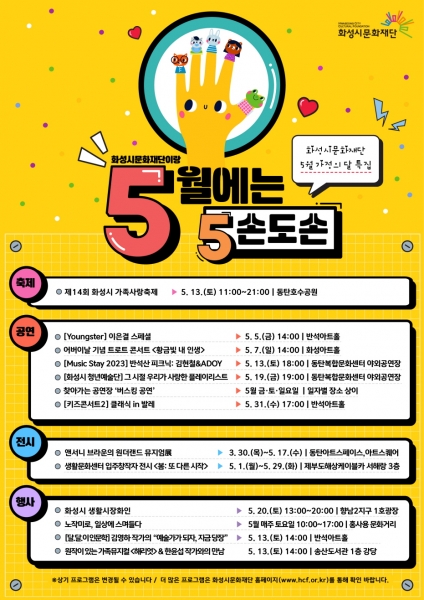 [금요저널] 화성시문화재단은 5월 가정의 달을 맞이해 공연, 전시, 축제 등 다양한 문화예술 프로그램을 개최한다고 밝혔다.