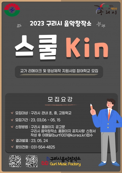 [금요저널] 구리시는 오는 5월 15일까지 구리시창작소에서 구리시 관내 초·중·고 학교를 대상으로 ‘2023 스쿨Kin’사업 참여 학교를 모집한다고 밝혔다.