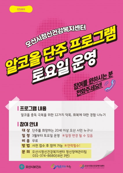 ‘알코올 단주 프로그램’은 단주를 희망하는 20세 이상 오산시민 누구나 참여할 수 있으며 비용은 무료이다.
