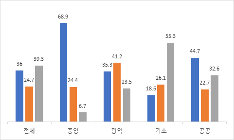 기관유형별로 보면, 중앙행정기관은 82.9점, 광역자치단체는 71.4점, 기초자치단체는 56.0점, 공공기관은 66.1점으로 기초자치단체는 공공데이터 제공 운영 수준을 높이기 위한 노력이 더욱 필요한 것으로 확인됐다.