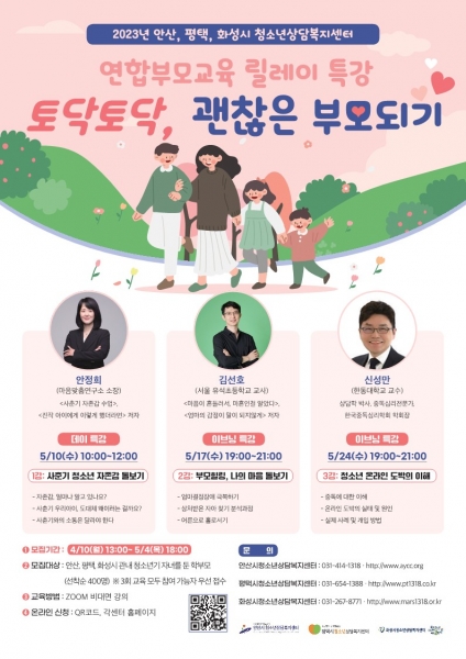 [금요저널] 평택시에서 평택YMCA에 위탁운영 중인 평택시청소년상담복지센터에서는 청소년의 달을 맞아 릴레이 부모교육 ‘토닥토닥, 괜찮은 부모되기2’ 특강을 온라인으로 진행한다.