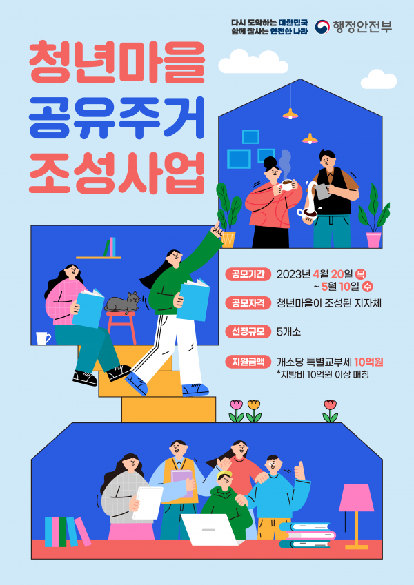 [금요저널] 행정안전부는 청년마을이 조성된 36개 지역을 대상으로 청년들의 보금자리를 조성하는 ‘2023년 청년마을 공유주거 조성사업’을 공개 모집한다고 밝혔다.