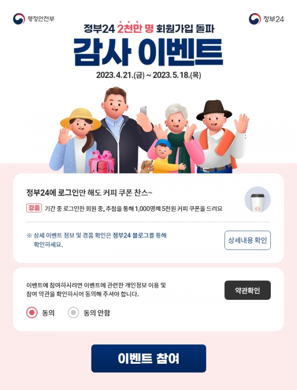 한편 행정안전부는 정부24에 대한 국민의 높은 관심과 성원에 감사를 담아 ‘회원 2천만명 돌파’ 온라인 행사를 4월 21일부터 5월 18일까지 진행한다.