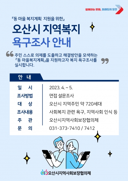 [금요저널] 오산시 지역사회보장협의체는 오는 19일부터 5월까지 오산시 최초로 전체 동을 대상으로 복지·건강 욕구조사에 들어간다고 밝혔다.