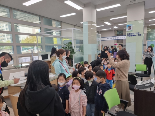 이날 어린이들은 민원실 업무 대기 번호표를 뽑고 직접 기다리며 호출에 응하는 등 실제 행정서비스 과정을 경험했다.
