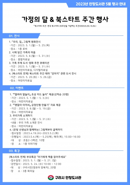 [금요저널] 구리시 인창도서관은 오는 5월 가정의 달을 맞아 자료실별 가족을 테마로 한 다양한 행사를 진행한다.