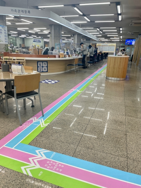 시는 민원창구 현수형 간판과 민원종합 안내판에 조명을 설치해 어두운 분위기를 개선했고 민원창구를 안내하는 색깔 유도선을 바닥에 부착해 민원인들이 더욱 편리하게 민원 업무를 처리할 수 있도록 했다.
