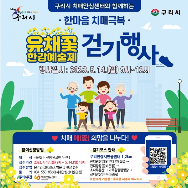 [금요저널] 구리시는 2023년 구리 유채꽃 한강예술제와 병행해 오는 5월 14일 치매환자와 가족, 지역주민을 대상으로 ‘2023년 한마음 치매극복 걷기행사’를 개최한다고 밝혔다.
