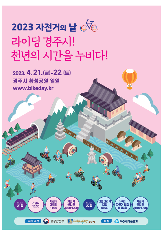 행정안전부와 경주시는 자전거의 날을 맞아 4월 21일부터 4월 22일까지 이틀간 2023 자전거의 날 행사를 개최한다고 밝혔다.
