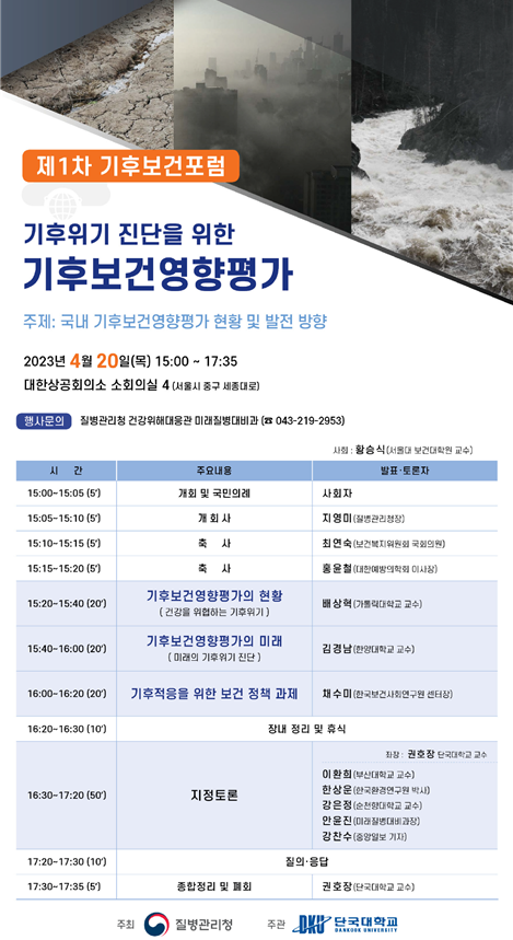 [금요저널] 질병관리청은 4월 20일 오후 3시 대한상공회의소에서 ‘기후위기 진단을 위한 기후보건영향평가’라는 주제로 ‘2023년 제1차 기후보건포럼’을 개최했다고 발표했다.
