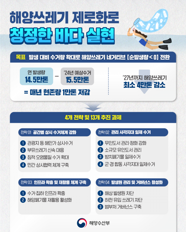 이에 해양수산부는 ’해양쓰레기 수거를 넘어, 쓰레기 영향 제로화 바다’를 비전으로 대규모 일제수거와 시설 확충 등을 통해 연간 해양쓰레기 유입량보다 수거량이 많아지는 ‘해양쓰레기 네거티브’를 달성하는 것을 이번 대책의 목표로 삼았다.