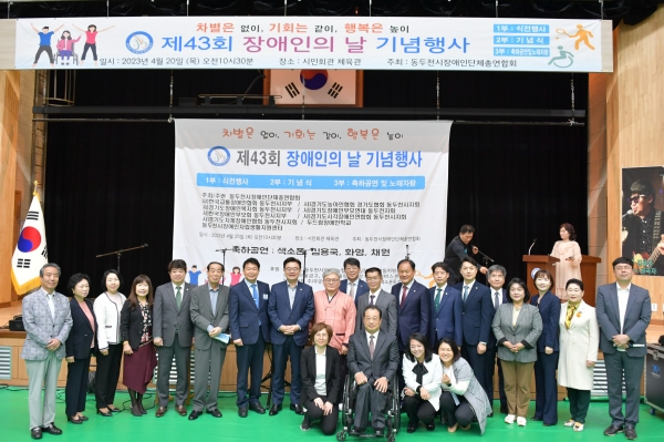 [금요저널] 동두천시장애인단체총연합회는 지난 20일 동두천시민회관에서 ‘차별은 없이, 기회는 같이, 행복은 높이’라는 슬로건으로 ‘제43회 장애인의 날’ 기념행사를 개최했다.