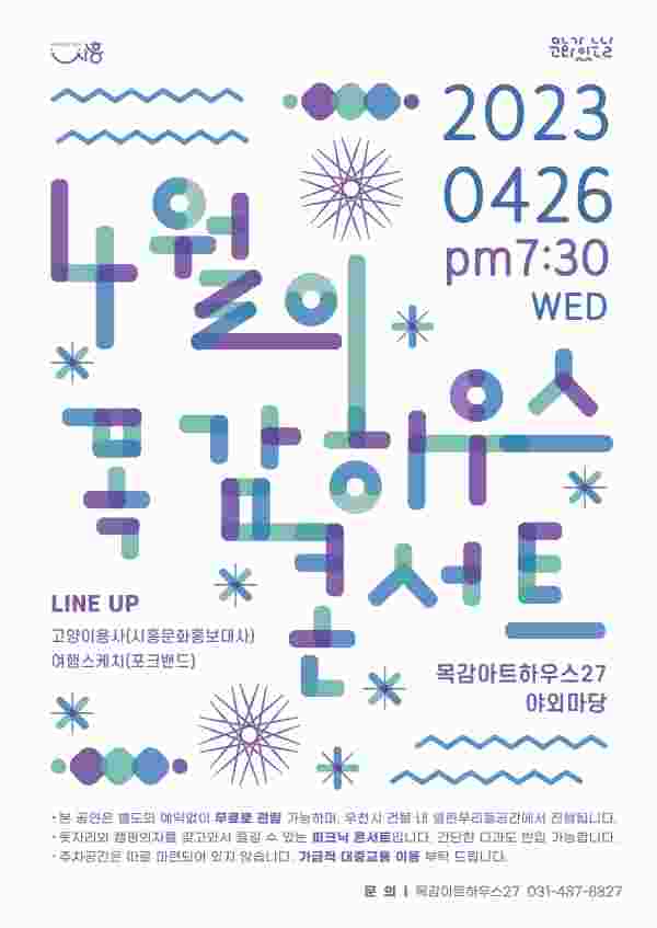 4월 26일 열리는 ‘목감하우스콘서트’의 첫 번째 공연팀은 ‘별이 진다네’, ‘왠지 느낌이 좋아’ 등 수많은 히트곡을 낳으며 음악성과 대중성을 겸비한 포크밴드 ‘여행스케치’와 매력적인 목소리의 시흥문화홍보대사 ‘고양이용사’가 출연해 가슴 따뜻한 연주로 감성 충만한 저녁 시간을 선사할 예정이다.