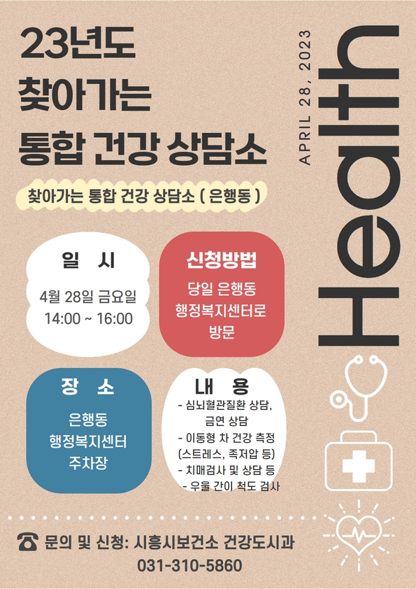 [금요저널] 시흥시 보건소는 지역주민의 건강 증진을 위해 오는 28일 오후 2시부터 4시까지 은행동 행정복지센터에서 ‘찾아가는 통합 건강상담소’를 운영한다.