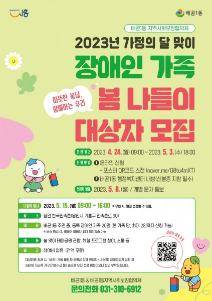 [금요저널] 배곧1동 지역사회보장협의체가 가정의 달을 맞아 진행하는 ‘장애인 가족 봄나들이’에 참여할 대상자를 4월 24일부터 5월 3일까지 모집한다.