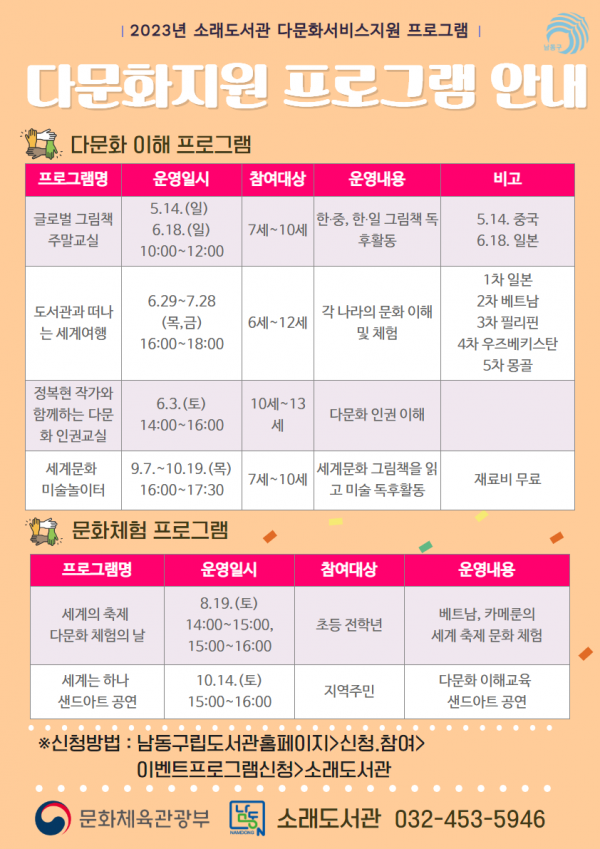 소래도서관은 올해 5~10월 중 글로벌 그림책 주말 교실 정복현 작가와 함께하는 다문화 인권 교실 도서관과 떠나는 세계여행 세계문화 미술놀이터 ‘세계의 축제’ 다문화 체험의 날 ‘세계는 하나’ 샌드아트 공연 등 6개 프로그램을 진행할 계획이라고 전했다.