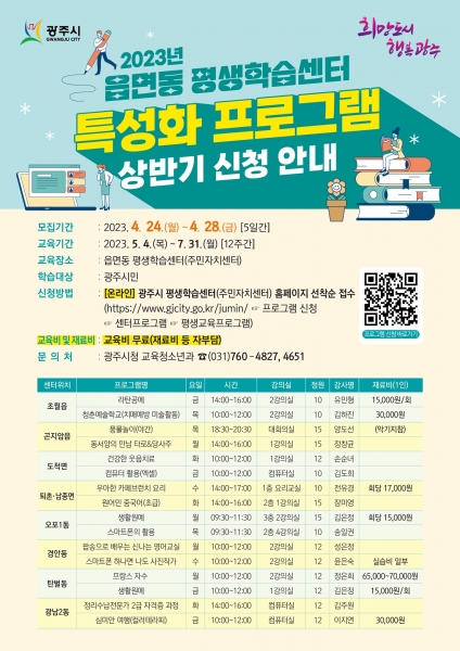 [금요저널] 광주시는 24일부터 28일까지 5일간 2023년 상반기 읍면동 평생학습센터 특성화 프로그램 학습자를 모집한다고 밝혔다.