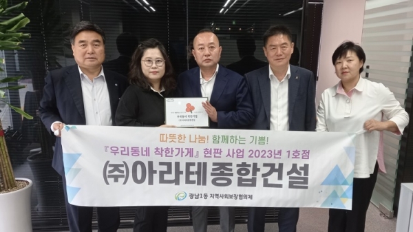 [금요저널] 광주시 광남1동 지역사회보장협의체는 20일 올해‘우리동네 착한기업’1호점으로 광남1동에 위치한 ㈜아라테종합건설를 선정, 현판 전달식을 진행했다.