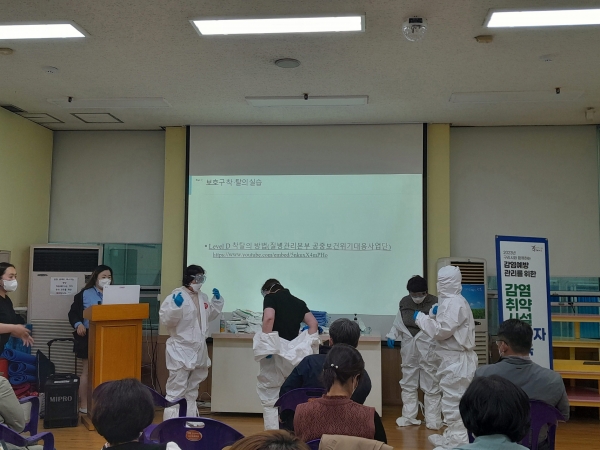 이날 교육은 역학조사관이 강사로 나서 감염관리 표준주의 전파 경로별 주의사항 환경관리 손 위생·개인보호구 착탈의 실습 순서로 진행됐다.