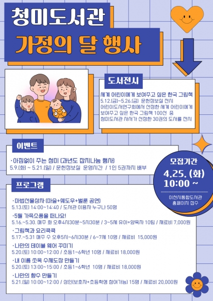 [금요저널] 이천시청미도서관에서는 5월 가정의 달을 맞이해 오는 5월 9일부터 31일까지‘가정의 달 행사’를 운영한고 밝혔다.