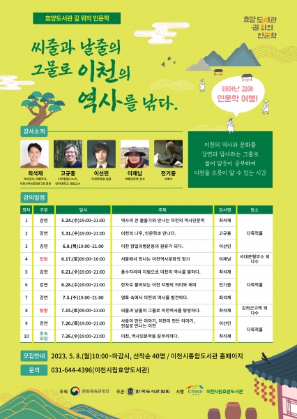 [금요저널] 이천시 효양도서관은 문화체육관광부가 주최하고 한국도서관협회가 주관하는 2023년 도서관 길 위의 인문학 사업에 선정돼 “씨줄과 날줄의 그물로 이천의 역사를 낚다”를 주제로 인문학강연과 탐방, 후속모임을 연계한 프로그램을 운영한다.