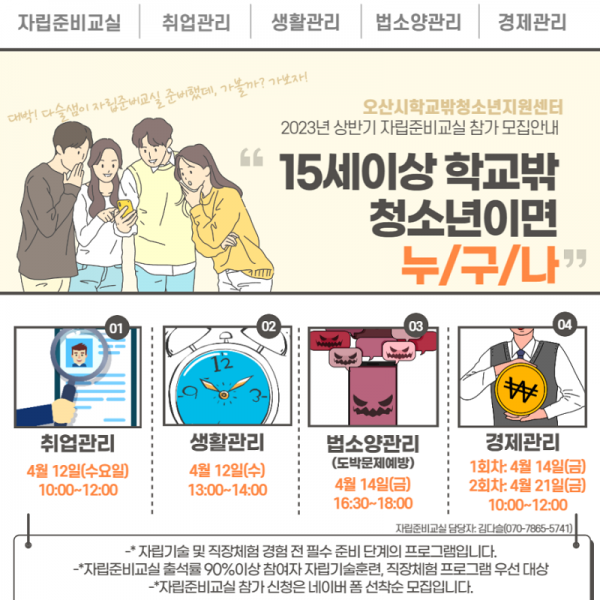 한편 오산시 학교밖청소년지원센터는 검정고시 교재 및 수강권 지원, 멘토링 지원 등 교육지원사업 분야와 개인 및 집단상담 지원, 직장체험, 직업훈련 학원비 지원과 같은 자립 지원 등 다양한 서비스를 청소년에게 제공하고 있다.