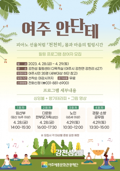 여주세종문화관광재단은 오는 28~29일 이틀간 강천섬 힐링센터에서 시범운영 프로그램 ‘여주 안단테’를 진행한다.