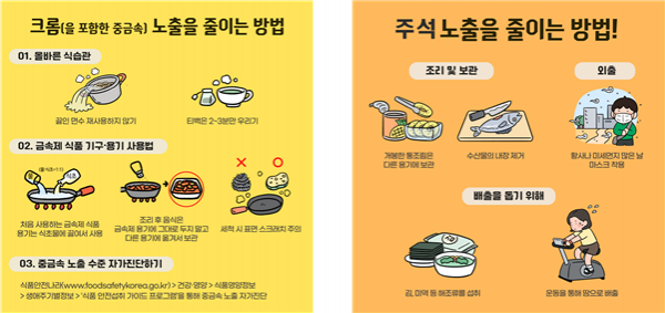 ‘크롬’은 해조류, 유지류 등과 같은 식품에서 주로 검출되지만 프라이팬, 냄비 등 식품용 기구·용기를 처음 사용하기 전 식초를 첨가한 물을 넣고 10분정도 끓인 후 씻어서 사용하면 크롬과 같은 중금속의 노출을 줄일 수 있다.