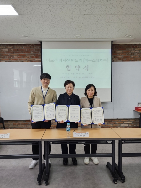 협약식에는 정미애 학익1동장, 이재리 학익1동 지역사회보장협의체 위원장, 이승연 인천종합사회복지관장 등이 참석했으며 협약을 통해 세 기관은 상호 협력체계를 구축하고 마음스케치북 사업에 대한 기관별 역할을 협의했다.