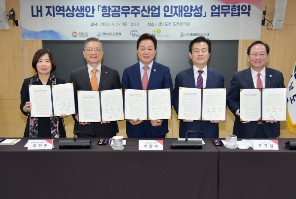 [금요저널] 경남도는 27일 도청 도정회의실에서 항공우주산업의 경쟁력 확보와 지역인재 육성을 위해 경상남도교육청, 진주시, 한국토지주택공사, 경남테크노파크와 ‘항공우주산업 인재양성 사업’ 업무협약을 체결했다.