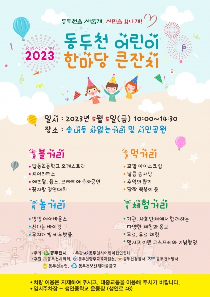 [금요저널] 동두천시는 제101회 어린이날 기념 “2023년 동두천 어린이 한마당 큰잔치”를 오는 5월 5일 어린이날 오전 10시부터 오후 2시30분까지 송내동 시민평화공원 일대에서 개최한다.