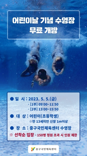 [금요저널] 인천중구시설관리공단은 오는 5월 5일 제101회 어린이날을 기념해 어린이를 대상으로 공단에서 운영하는 중구국민체육센터 수영장을 무료 개방한다고 28일 밝혔다.