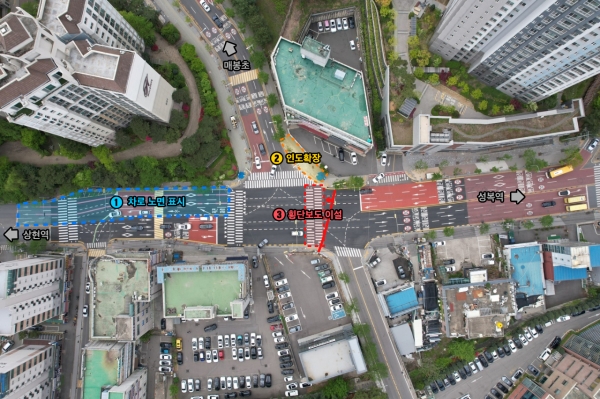 또 인근 상가 주차장에서 나온 차량과 보행자의 접촉사고를 막기 위해 횡단보도를 이설, 휘어진 형태를 바로잡았다.