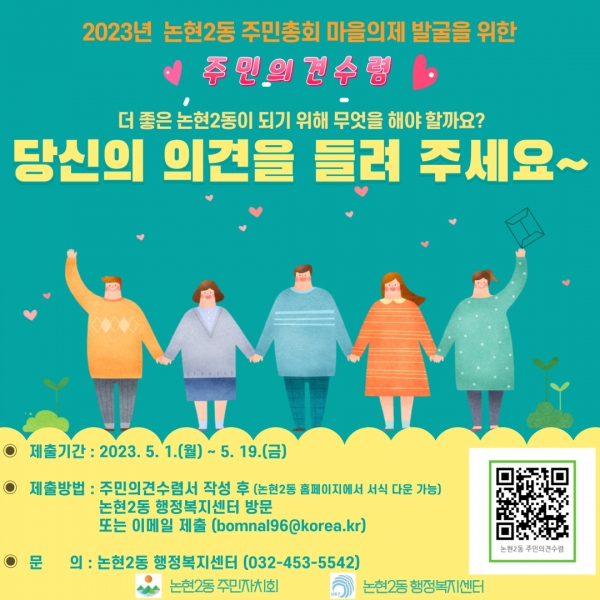 이번 마을 의제 주민 의견 접수는 논현2동의 발전을 위한 주민들의 목소리를 듣는 과정으로 논현2동 주민이면 누구나 오는 19일까지 논현2동 행정복지센터를 방문하거나 이메일을 통해 자유롭게 의견을 제안할 수 있다.
