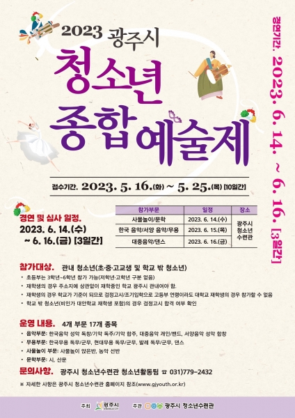 광주시가 주최하고 광주시 청소년수련관이 주관하는 2023년 광주시 청소년종합예술제는 지난해에 이어 오프라인 형태로 진행된다.